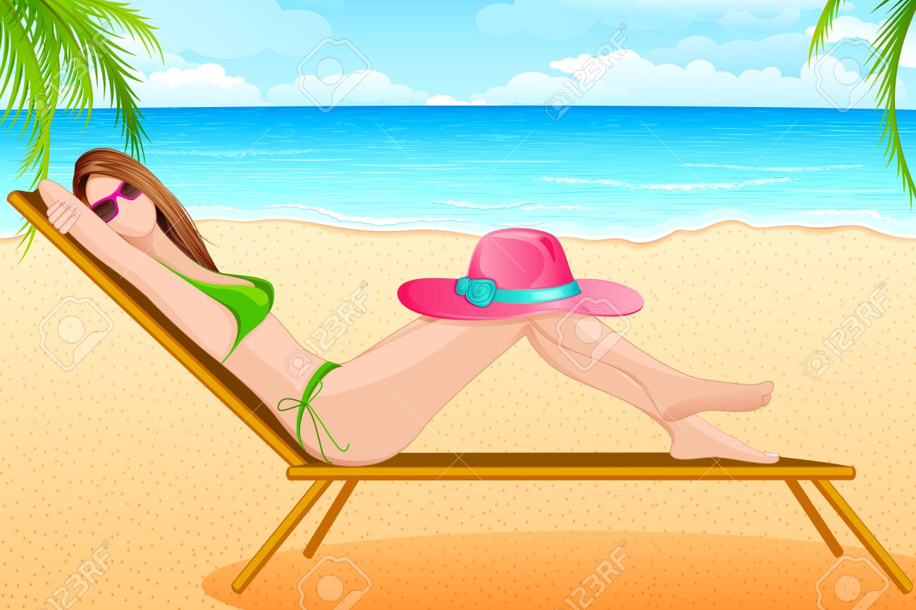 Source: previews.123rf.com Woman in biking on beach chair vector cartoon clipart. Black and white photo of gorgeous young woman sitting on beach chair and holding glass of refreshing orange juice. Woman relaxing in beach chair.
